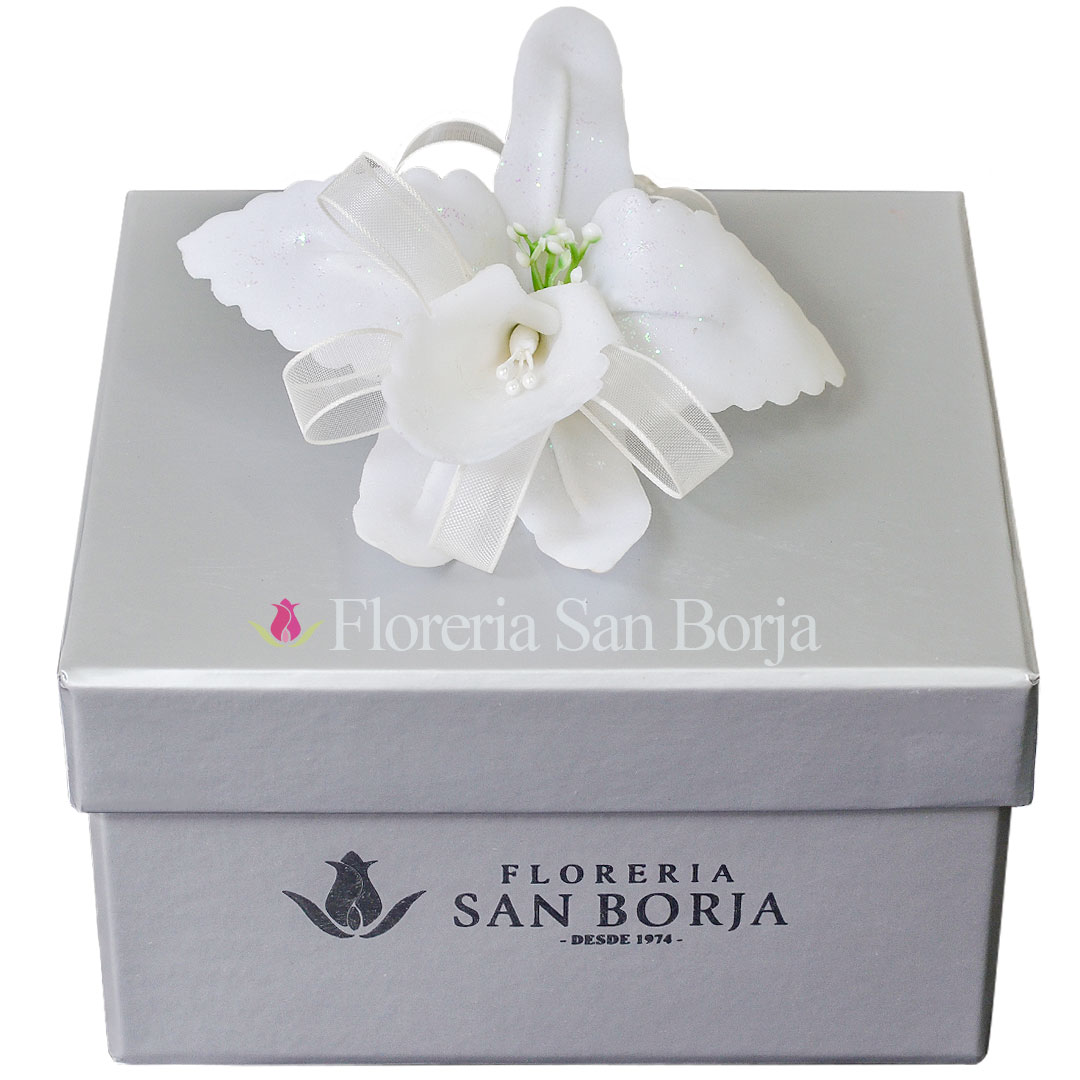 Elegante corsage de orquidea artificial blanca en box premium para la muñeca. Contamos con presentación en elegante box premium
