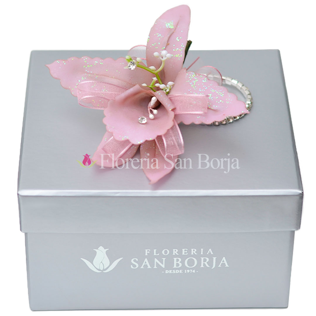 Elegante corsage de orquidea artificial rosada en box premium para la muñeca. Contamos con presentación en elegante box premium