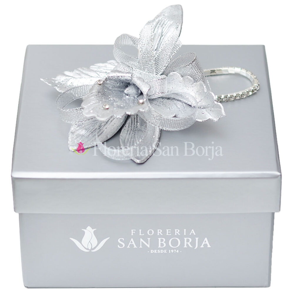 Elegante corsage de orquidea artificial plateada en box premium para la muñeca. Contamos con presentación en elegante box premium