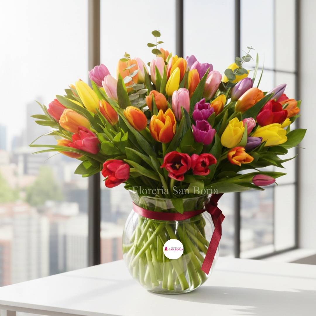 ¡Ilumina su día con 50 coloridos tulipanes en florero de vidrio y sorprendela!