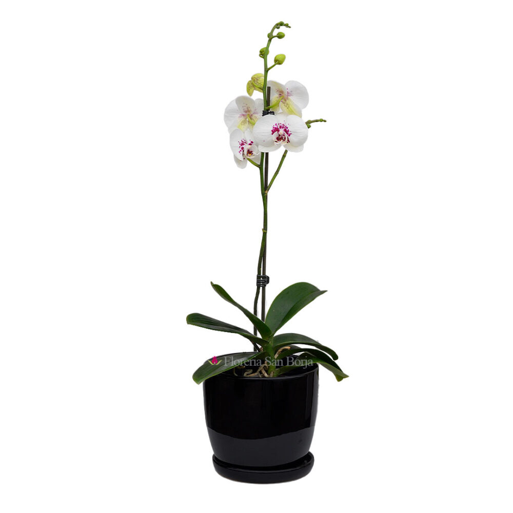 Planta de orquídea blanca centro púrpura en base de cerámica