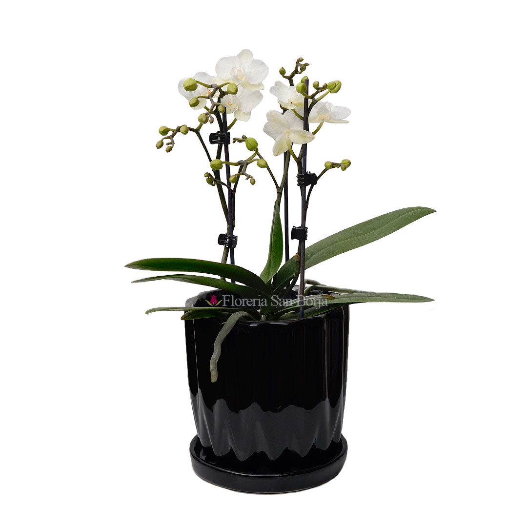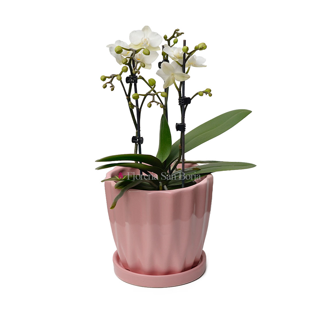 Planta de Orquídea mediana de flores chicas blanca centro amarillo en base de cerámica – 2 varas